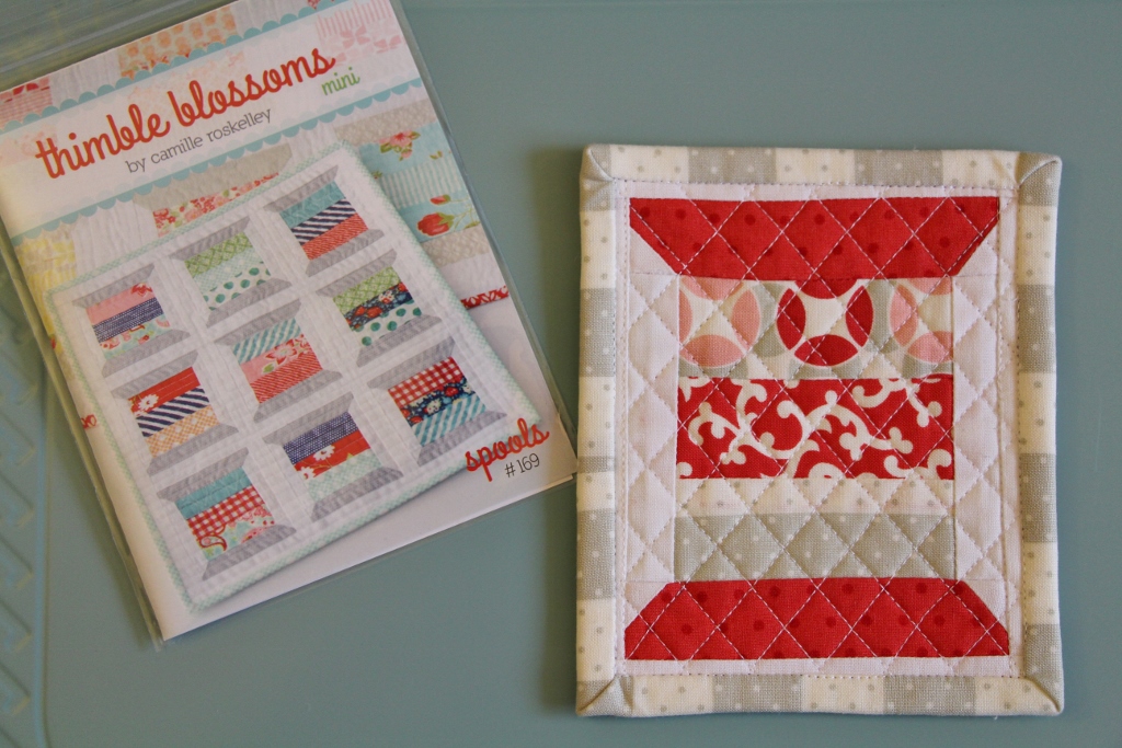 In between some secret sewing (also scrappy) I stitched up a little mug rug. The original pattern is Spools by Camille of Thimbleblossoms.