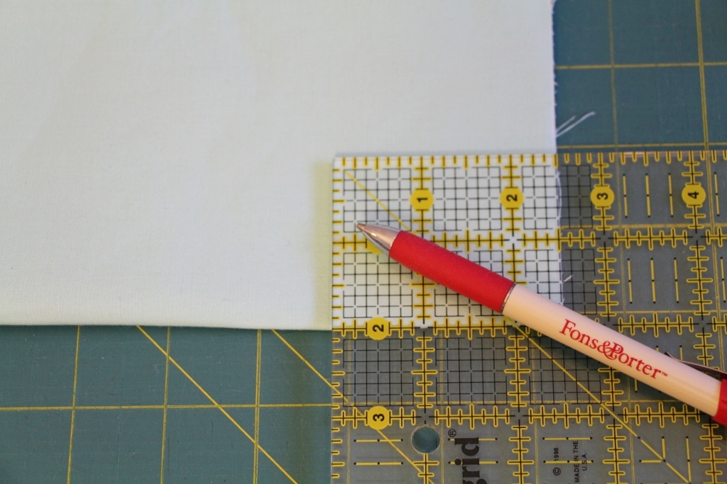 For the large size bag, we are going to box cut it 2.5″ from the outer unsewn edge and 2″ in from the bottom, folded edge. Mark the line with a fabric pencil.