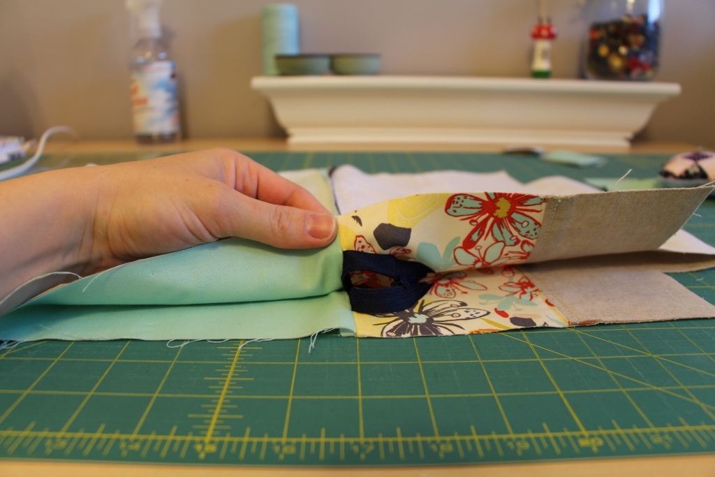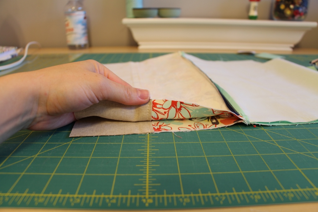 Allign everything so that the layers are smooth and the edges of the contrast panel (above) match up. Do this on each side and pin the layers in place. When we turn everything right side out later, the pouch edges will line up and look professional. Iron the bottom fold so that it lays nice and flat for the next step.