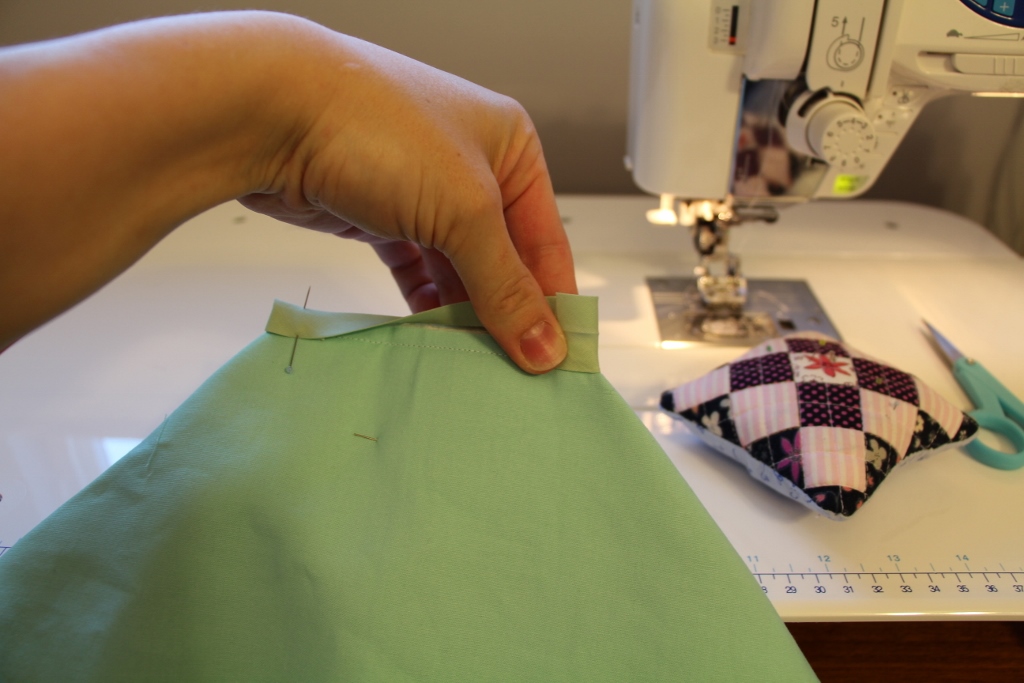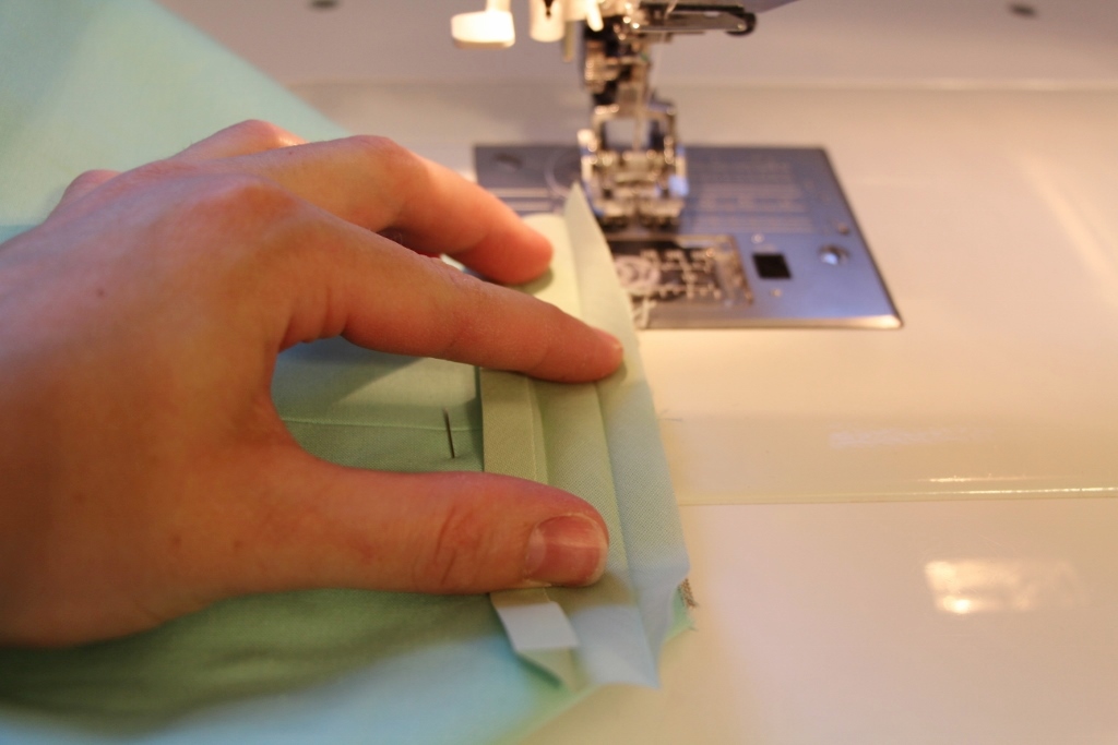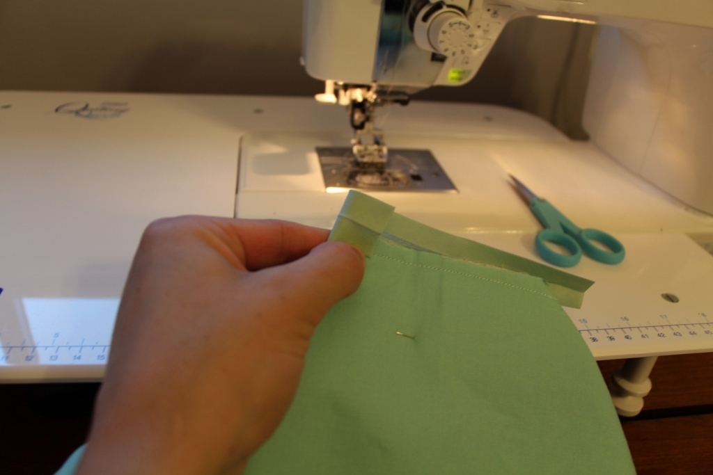 Fold in the other side and repeat the pinning process, but this time, put your pin out at a 90 degree angle, just catching the bias tape and the lining. (This prevents my sewing machine from eating my pin as I stitch or it getting caught.)