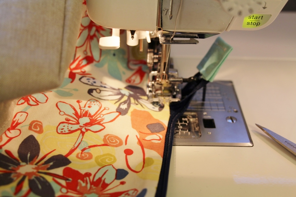 Position your needle, 1/4″ in from the edge and a bit above where you started sewing your last seam (as we are now sewing in the other direction), and start sewing. When you reach the pull part of the zipper while sewing, stop with the needle down, and lift the presser foot all the way up, and shift the zipper pull behind the presser foot, before continuing sewing.