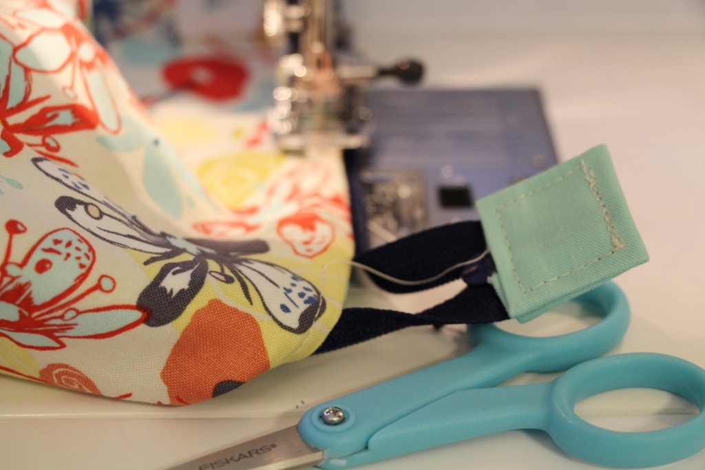 When you get to the bottom of the bag panel, about 1″ up from the edge, stop with your needle in a down position, and shift the zipper to the left. I find it helps to lift the presser foot and lower it to release the tension in the fabric at this point. Once the zipper is out of the way, continue sewing until the end of the fabric and remember to back stitch.