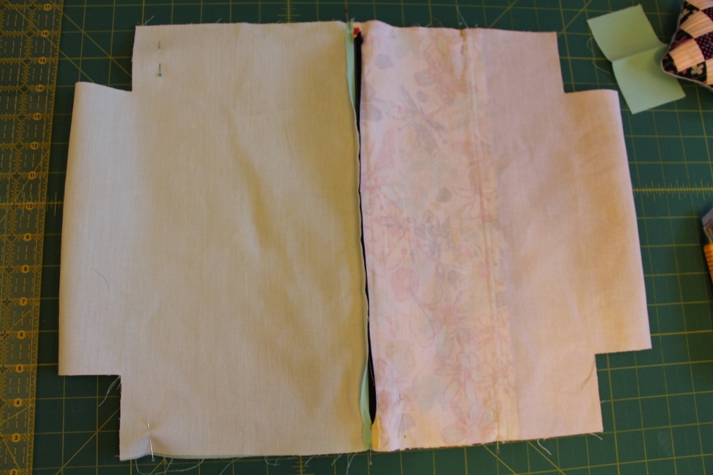 Slip the outer part into the lining. This is where we are going to make sure that the parts we just ironed open stay open and flat and line up when folded in half. (You will need to put your hand in side and make sure that the seam stays open all the way to the to edge of the bag and work down from there.)