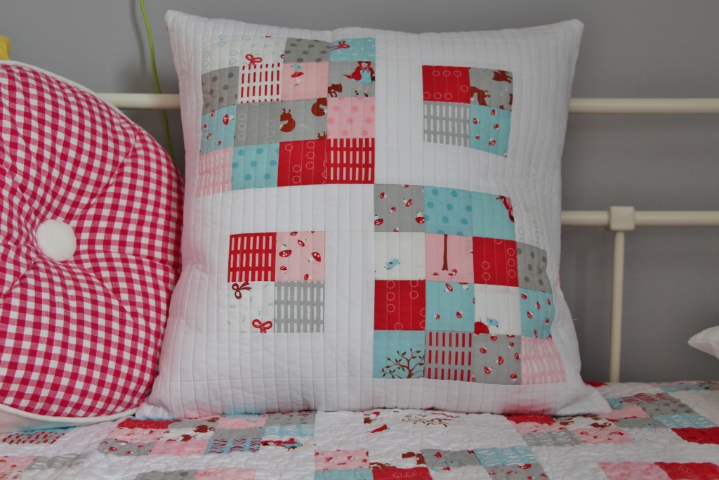 I’ve wanting to try my hand at pillow and pillow form making. I had a few extra blocks from the quilt top, so I made a pillow front and quilted it with a straight -line pattern. I followed the lovely tutorials from here for how to make the envelope back and here for how to make a pillow form. In my case, I had to jerry-rig the back of the pillow as I wanted to use all the leftover edges of the quilt backing. I added four panels of white, also from the scrap bins, and it all worked out.